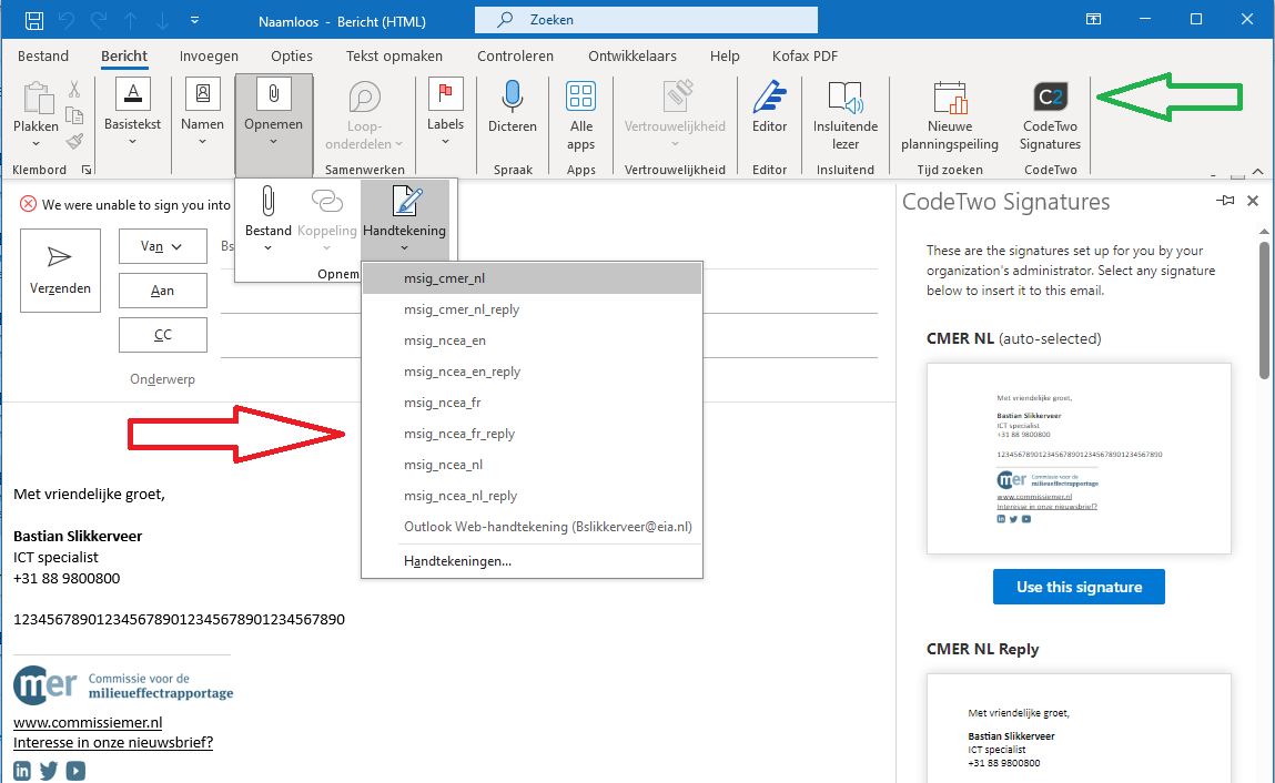 De werkwijze is veranderd. Als je een nieuw e-mailbericht maakt, verschijnt een Outlook add-on (groene pijl) waarmee je tussen je verschillende handtekeningen kunt kiezen. Druk hierbij op het icoon van CodeTwo Signatures.