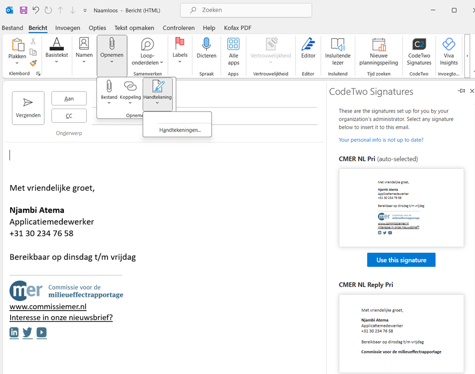 Zie ook de handleiding: Handleiding handtekening CodeTwo Signatures Outlook add-on.docx
