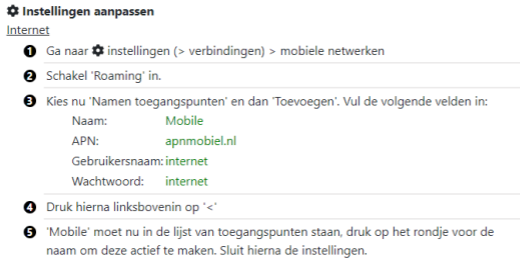 De leverancier heeft eerder aangegeven dat er soms handmatig een specifieke netwerkaanbieder gekozen moet worden, i.p.v. automatisch. Zie hier een generieke videoinstructie. Dit zou dan gewoon met onderstaande APN instellingen moeten werken.