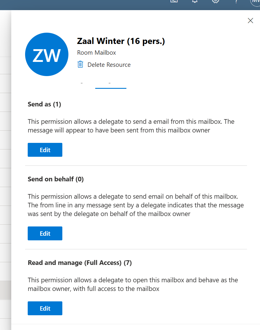 Klik op zo'n resource (Room Mailbox) en dan het tabblad "Delegation". Daar kun je via het subtabje "Read and Manage (Full Access)" iemand machtigen via "add member" (of ook weer weghalen).